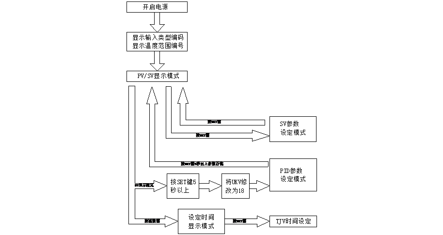 當(dāng)PID參數(shù)設(shè)定模式出現(xiàn)到“Pkv”時(shí),PV顯示“Pkv”,SV顯示“0”(默認(rèn)),此時(shí)按“SET”鍵,SV顯示值閃爍,可按“