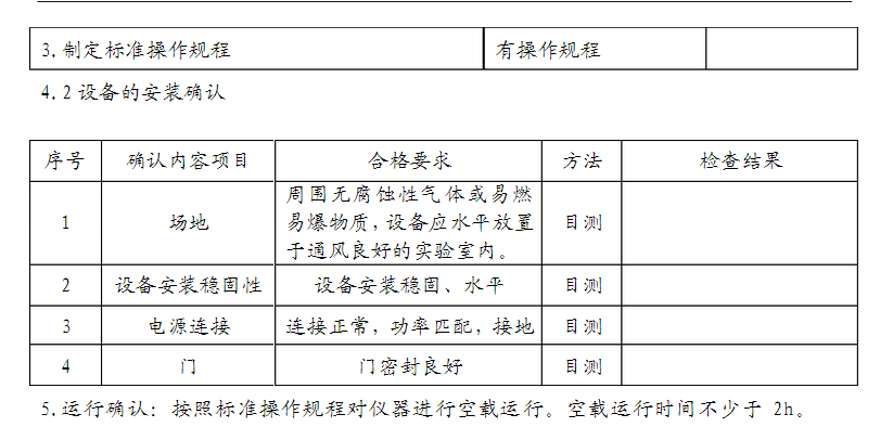 2.驗證目的:通過對設備資料檢查,運行、性能的確認,確保儀器的相關資料的齊全、完整,各項性能穩(wěn)定,從而保證檢驗的準確、可靠。 3.驗證依據:???? 4.設備的預確認 4.1操作規(guī)程等資料確認