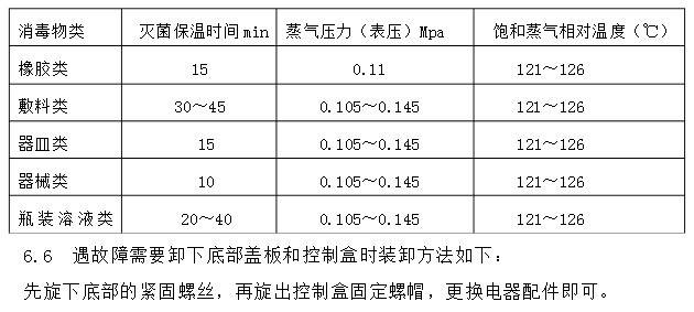 6.5 消毒物品所需的滅菌時間、蒸汽壓力/溫度對應關系見下表(僅供參考) 消毒物品所需滅菌時間、蒸汽壓力/溫度對應表(僅供參考)